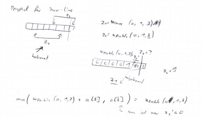 • Hierbei wird ausgenutzt, dass man die vorherigen Summen weiterverwenden kann: \(w(a,i,k+1) = w(a,i,k) + a[k+1]\)