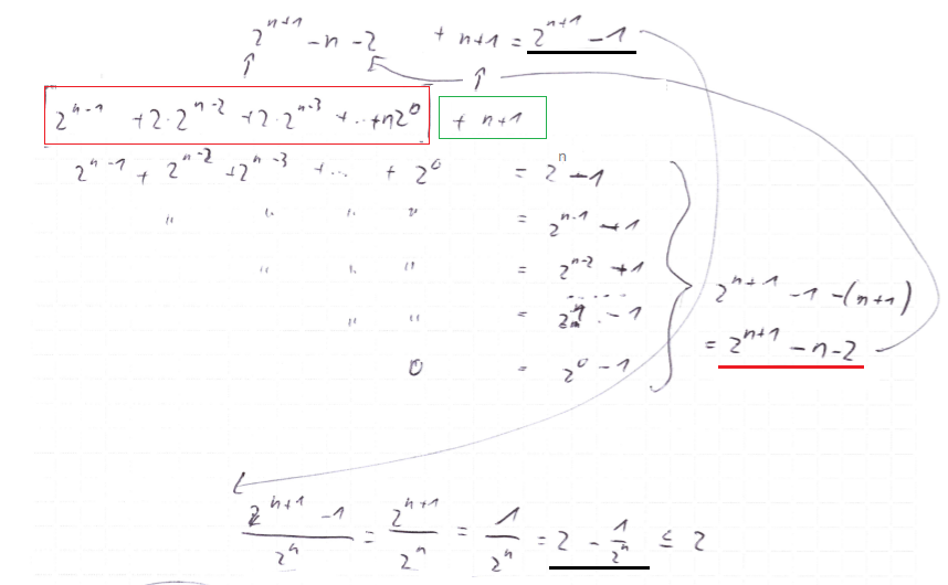 • Daraus ergibt sich: \(V(n) = n+(n-1)+(n-2)+…-1=\sum_{n}^{i=1}\frac{n*(n+1)}{2}-1 \)